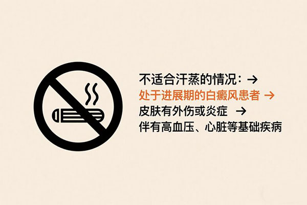 处于进展期的白癜风患者(白斑仍在扩散),应禁止进行汗蒸、桑拿。进展期患者皮肤状态不稳定,高温刺激可能加重皮肤损伤,诱发同形反应,导致新的白斑出现或原有白斑扩大;同时高温可能影响免疫系统,进一步加剧病情波动,因此进展期患者需避免任何形式的高温刺激。